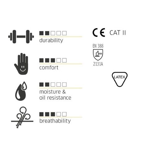 13G poliészter kötött kesztyű, rugalmas, nedvességtaszító latex gyűrött bevonattal. Ez a kesztyű kiváló fogásbiztonságot ígér száraz, nedves, vizes és olajos felületeken is.