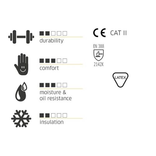 Varrás nélküli, középen kötött kesztyű kefélt poliészterből, latex gyűrött, vízlepergető és olajlepergető bevonattal. Jó kézügyességet és biztos fogást biztosít még sima tárgyakon is.