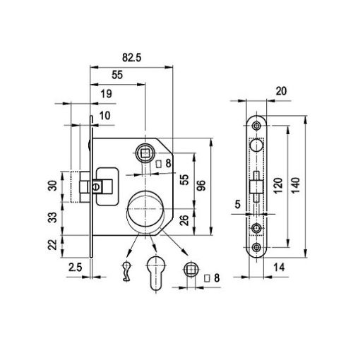 Elsősorban fa ajtókhoz használható, hengerzárbetétes bevésőzár, méretei: 20mm széles, 140mm magas, 83mm mély