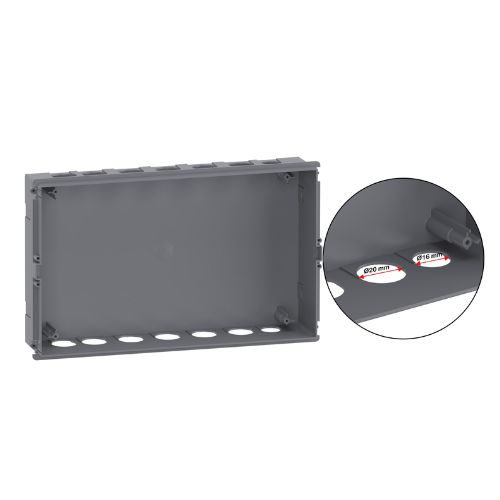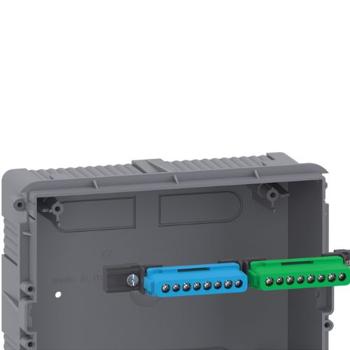 Ez az Easy9 EU termék egy falon kívüli, moduláris kiselosztó. 2 sorban 12 darab 18 mm-es modulból áll. Minden típusú moduláris kapcsolóberendezéshez használható. 1 földelő és 1 nulla csatlakozóblokkot tartalmaz a tartójukkal együtt, és mindegyik csatlakozóblokk 16 lyukkal rendelkezik (8x16mm2 + 8x10mm2). Megfordítható, átlátszó, füstszínű ajtóval rendelkezik, amely 180°-ban kinyitható. A kiselosztó fehér színű (RAL 9003). Ez a kiselosztó beltéri használatra készült. Az IP védettségi fokozat IP40 védettségű zárt ajtó és IP30 védettségű nyitott ajtó esetén. A szekrényben nincsenek kivágások, a szerelők fúrógépet használhatnak a kivágáshoz. Új építésű épületekhez vagy meglévő lakossági épületek felújítása esetén is ideális választás. A In névleges áramerősség akár 63 A. Az Ui névleges szigetelési feszültség 500 V. Az Ue névleges üzemi feszültsége 400 V. A kiselosztó belső elemei egy DIN-sínnel ellátott, kivehető váz és egy kivágással ellátott elülső fedél. A méret (szélesség) 256mm × (magasság) 326mm × (mélység) 103mm. Szélessége 9 mm-es osztásban 48. A termék tömege 1,25kg. A ház önkioltó műanyagból készült. Lángokkal és rendellenes hővel szembeni ellenállása 650 °C, 30 perces időtartamig az MSZ 60695-2-10 szabványnak megfelelő. Az elektromos szigetelési osztály II. osztályú (kettős szigetelésű). A szennyezési fok 2. Az MSZ 62262 szabvány szerint az IK védelmi fokozat IK07. Az üzemi hőmérséklet -25°C és +60°C között van. A tárolási hőmérséklet -25°C és +70°C között van. Ez a szekrény megfelel az MSZ 60670-1-24 szabványnak.