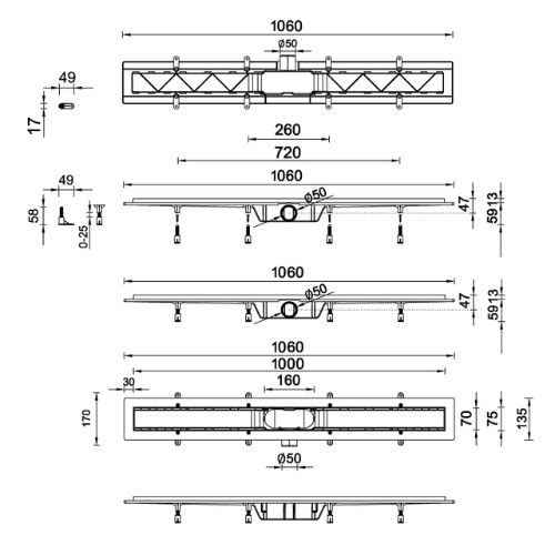 Styron beltéri zuhanyfolyóka, egyenes, 1000 mm-es, HARMONY rozsdamentes fedráccsal, golyós bűzzárral, oldalsó kifolyással, elfolyás átmérője: 50 mm