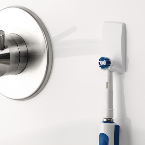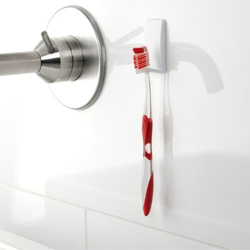 Műanyag, fehér színű, szögletes, vízálló, öntapadó fogkefe tartó - akasztó, akár 2 kg-ig terhelhető.