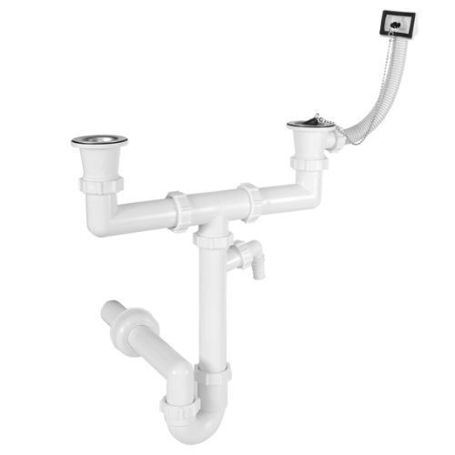 Styron kétmedencés mosogató csőszifon, túlfolyóval, két szeleppel, D40mm